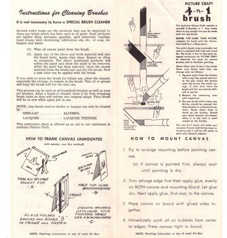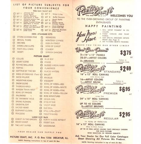 Kit series You Can Paint Set 1-12 Picture Craft 1938-Many Years (12x16) Premier Large 18x24 Standard STD1-12 12x16 ListOfSubjectsNewestFront Number of pages 2 pages Manufacturer Picture Craft Manufacturer address PO Box 1256 , Decadur , Ill. Notes This List may be the newest of the three List of Subjects because it lists additional subjects , shows a higher price on the Premier and explains using the 4 in 1 bush in instructions on back of list ListOfSubjectsNewestTheBack Number of pages 2 pages PreviousNext