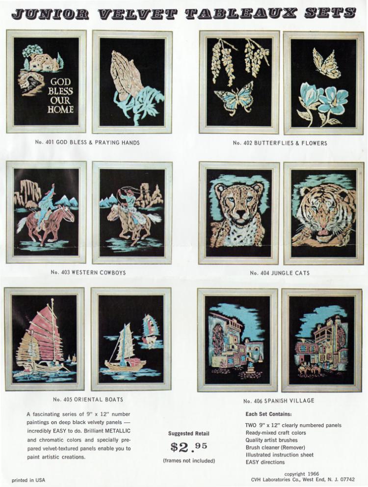 CVH Junior Velvet Tableaux Sets Number of pages 1 pages Manufacturer CVH Manufacturer address CVH Laboratories Co., West End, NJ 07742 Date 1966 Notes 6 sets of two 9x12 velvet paintings