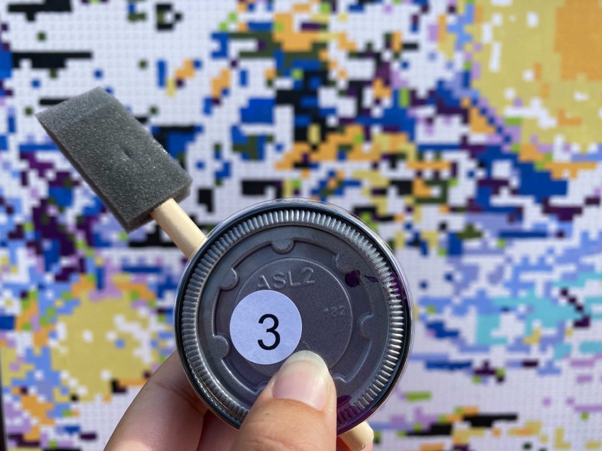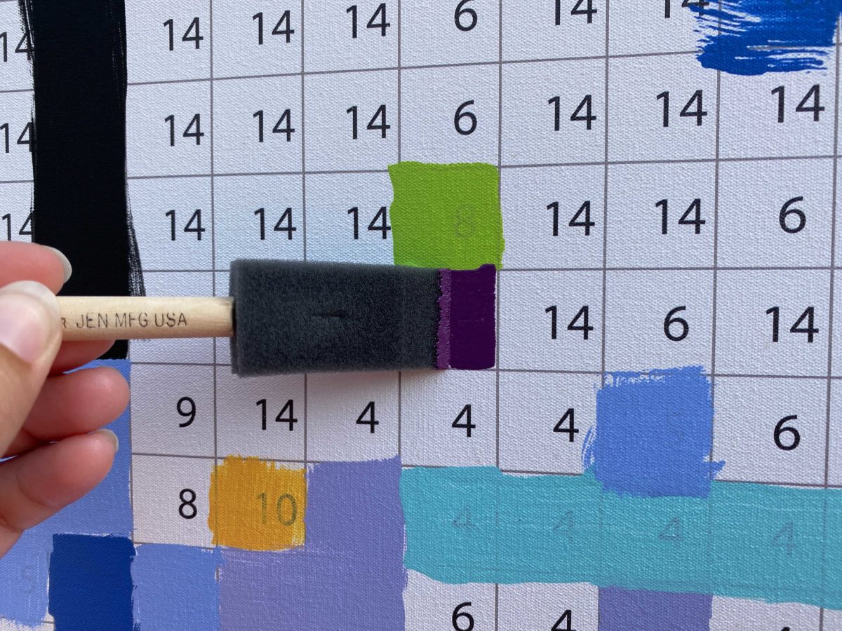 Visitors are instructed to choose one of the numbered colors, are given a brush and paint, and then fill in 8 sections that correspond with their number. The visitors all collaborate to fill in the Van Gogh-inspired mural.