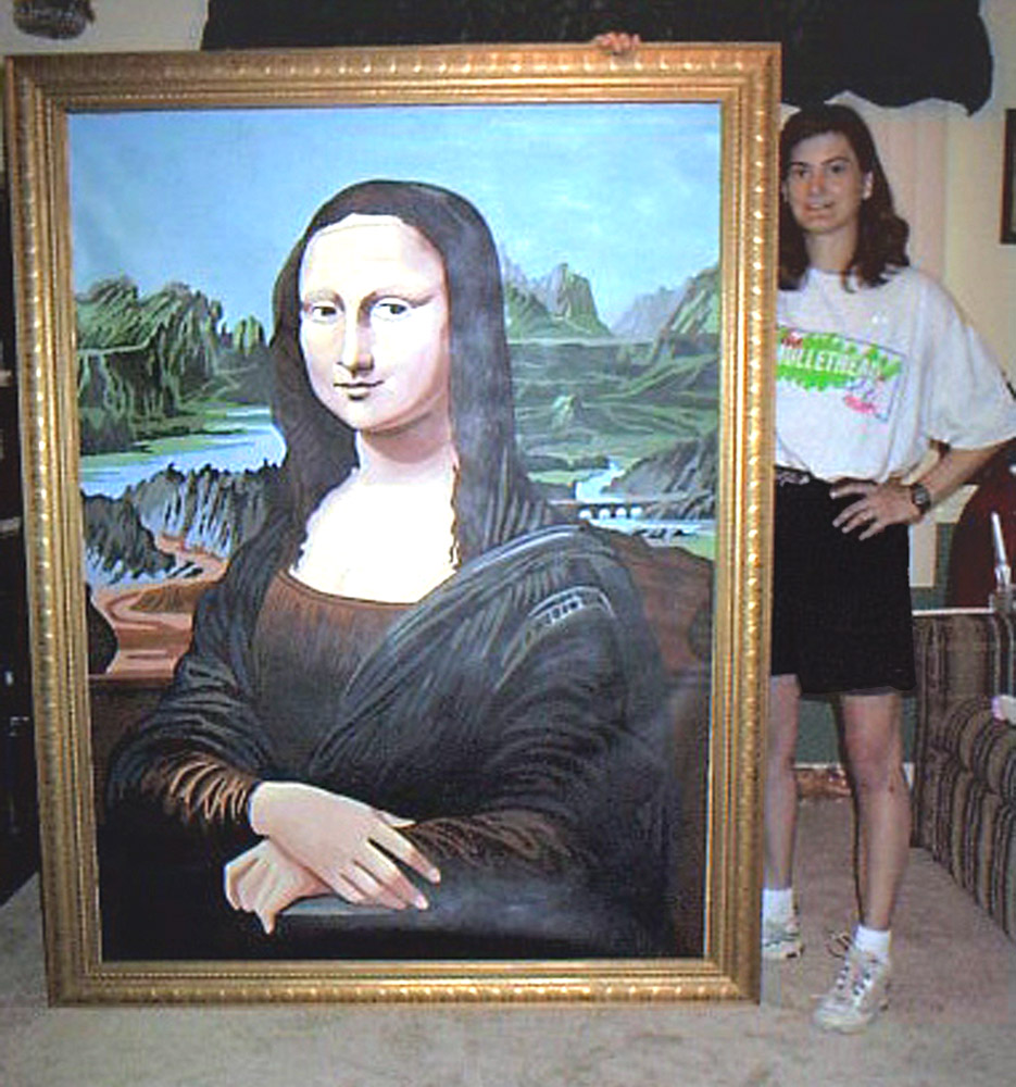 Thanks to Ebay, Ms. Savell also found access to a growing community of enthusiasts. They had also been avid painters as children and were now revisiting paint-by-numbers as collectors and archivists. She eventually came into contact with Dan Robbins and Doug James, the major designer and collector of the earliest Craft Master paint-by-number kits. Ms. Savell remembers how Doug James became a major force in her development as a restorer: “ He sent me some very valuable canvases to paint for him. I almost fainted when Doug and Dan asked me to paint the first prototype of the Dan Robbins’ ‘Mona Lisa Smile’ kit that promoted the movie. I was completely beside myself to have had the opportunity!” With the support of other paint-by-number enthusiasts, Ms. Savell eventually embarked on a masterpiece project: producing and painting a 44X62 “Mona Lisa”. With a super-sized rendering “The Last Supper” also under her belt, she is looking for new larger-than-life subjects to tackle.