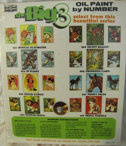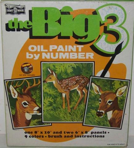 big3kit Manufacturer Craft House Manufacturer address 2101 Auburn Avenue , Toledo , Ohio 43696 Kit Contents one 8x10 and two 6x8 panels , 9 oil paints Notes Catalog on back of kit