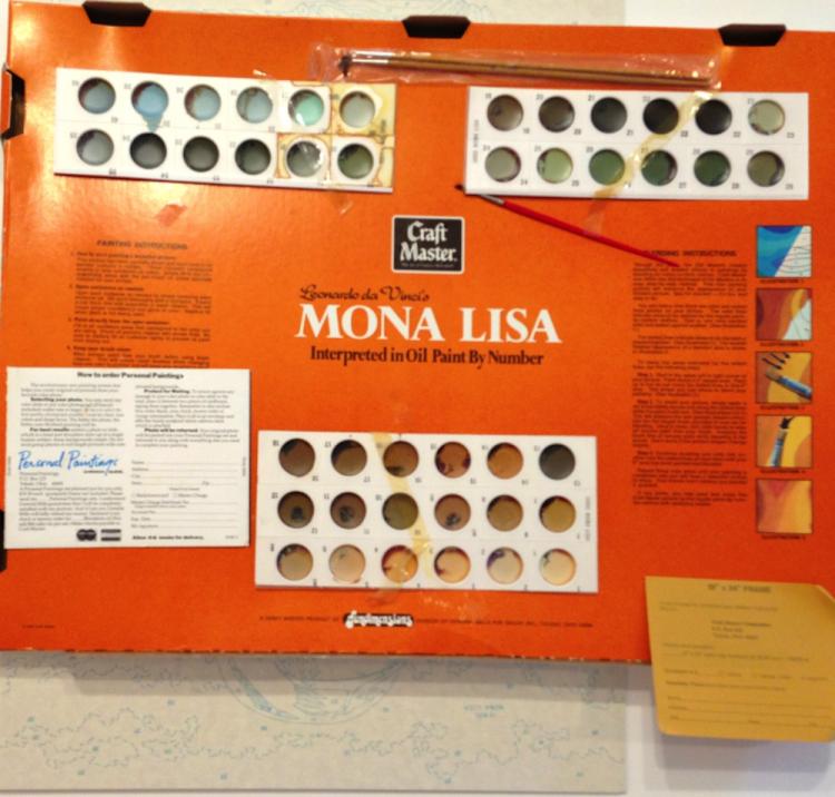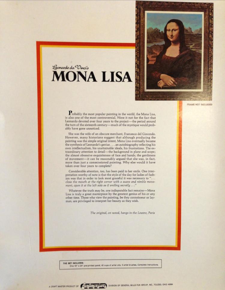 Kit series Mona Lisa 18x24 1973 MonaLisa1973 Manufacturer Craft Master Manufacturer address Fundimensions , division of General Mills Fun Group , Inc. , Toledo , Ohio 43694 Date 1973 Kit Contents one 18x24 panel , 42 oil paints Notes No catalog in or on kit , copyright 1973 on kit MonaLisaKitBack MonaLisaKitContents PreviousNext