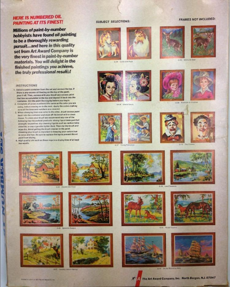 aCollieCover Manufacturer Art Award Manufacturer address North Bergen , N.J. 07047 Kit Contents two 12x16 panels , 24 oil colors Notes copyright 1974 The Art Award Co., Inc. Catalog on back of kit