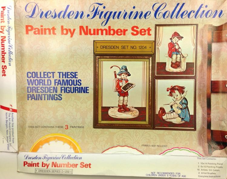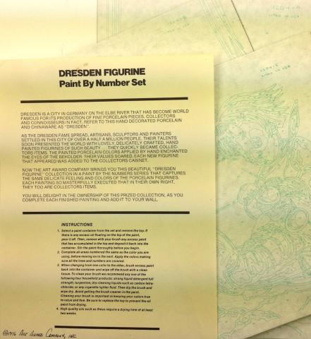 Kit series Dresden Figurine Collection aDresdenSeriesD1250Cover Manufacturer Art Award Manufacturer address North Bergen , New Jersey 07047 Date 1976 Kit Contents one 10x14 and two 8x10 panels , 18 oil colors Notes No catalog - copyright 1976 DresdenFigurineContents DresdenFigurinePaints PreviousNext