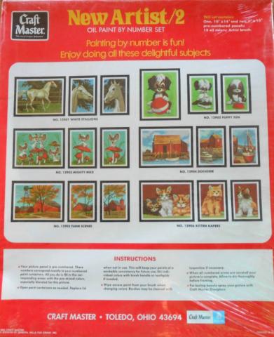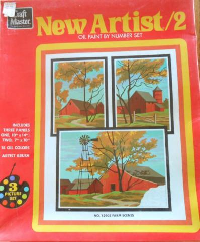 Kit series New Artist/2 12901-6 aFarmScenes12905FrenchCover Manufacturer Craft Master Manufacturer address Toledo , Ohio 43694 Date 1972 Kit Contents one 10x14 and two 7x10 panels , 18 oil colors Notes Catalog on back of kit -Copyright 1972 Craft Master, Division of General Mills Fun Group , Inc FarmScenes12905KitBack PreviousNext