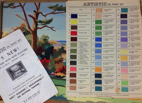 Series of 8 kits , one 12x16 canvas panel , 6 oil colors to be mixed according to color chart and painted on the pre-numbered canvas panel