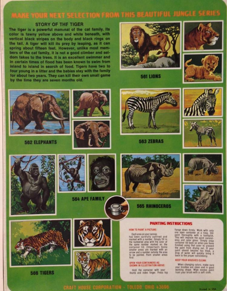 aaTigers566Cover Manufacturer Craft House Manufacturer address Toledo , Ohio 43696 Date 1975 Kit Contents one 9x12 and two 6x8 panels , 12 acrylic paints Notes Catalog on back of kit , copyright 1975 on panels