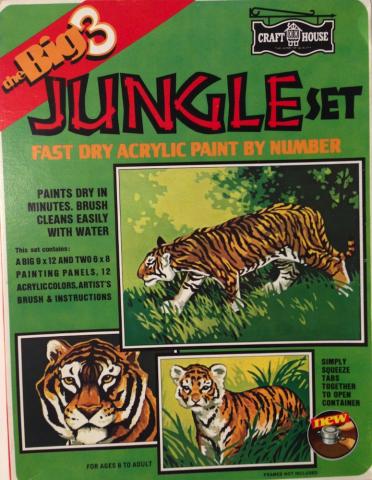 Kit series Big 3 Jungle 561-6 aaTigers566Cover Manufacturer Craft House Manufacturer address Toledo , Ohio 43696 Date 1975 Kit Contents one 9x12 and two 6x8 panels , 12 acrylic paints Notes Catalog on back of kit , copyright 1975 on panels aatigers566KitBack aaTigers566PanelsPaints PreviousNext