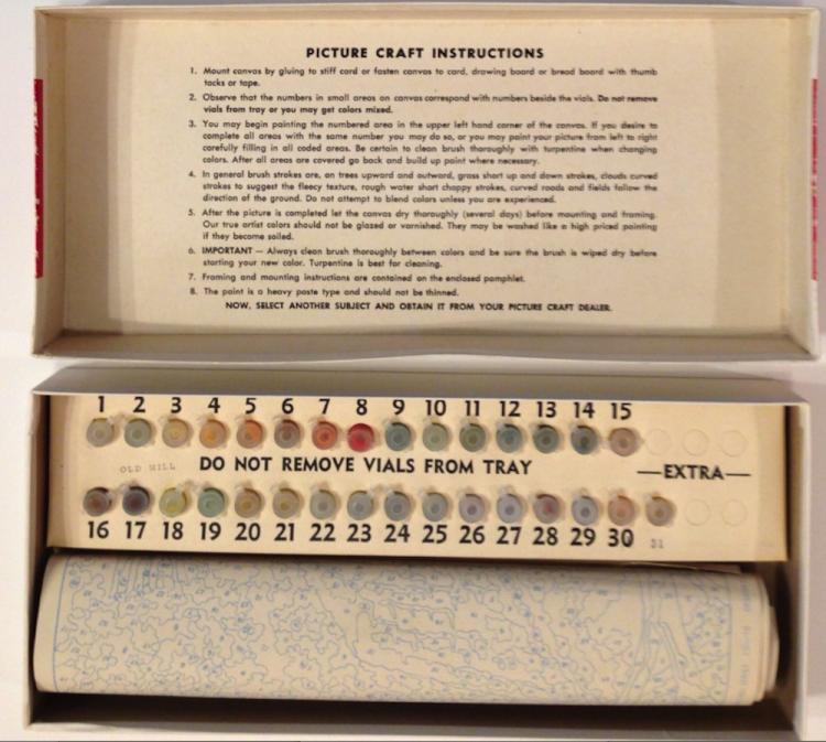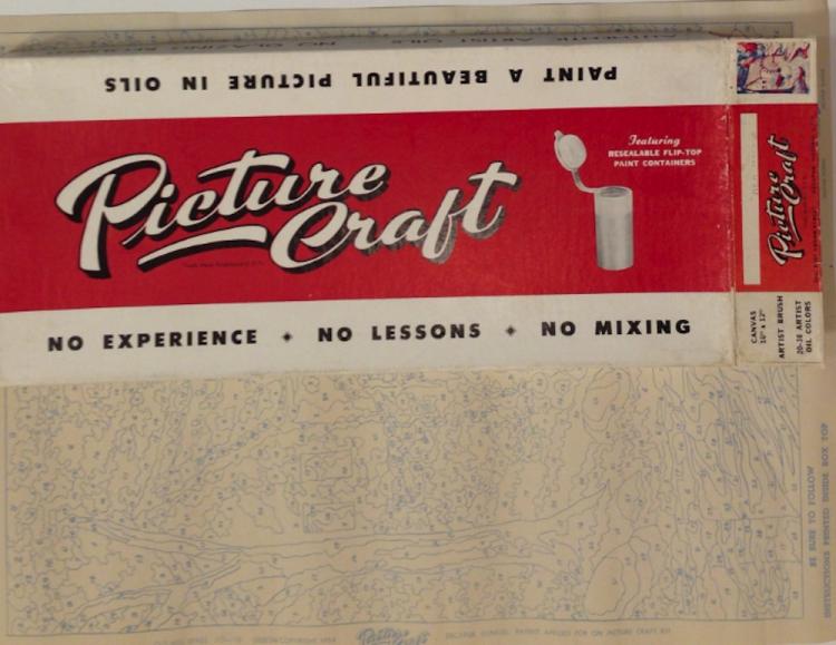 Kit series PictureCraft Flip-Top JG1-? 12x16 OldMIllJG-10CoverCanvas Manufacturer Picture Craft Manufacturer address 2220 East Logan Street , Decatur , Illinois , U.S.A. Date 1954 Kit Contents one 12x16 canvas , 20-30 oil paints Notes copyright 1954 on canvas OldMIllJG-10Paints PreviousNext
