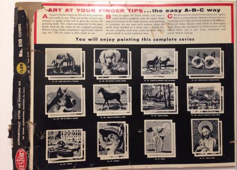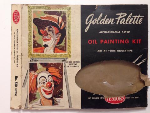 Clowns501Cover Manufacturer Testors Manufacturer address Rockford , Illinois , USA Kit Contents two 8x10 panels , 8 oil paints Notes Series of 12 kits , alphabetically keyed , same series as Master Palette 501-12