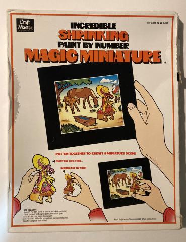 Magic Miniature Dimensions 9.5x12.25x1 Manufacturer Craft Master Date 1975 Kit Contents One shrinking PBN sheet, 3 paints, glue, 5x6 backing panel, printed background panel