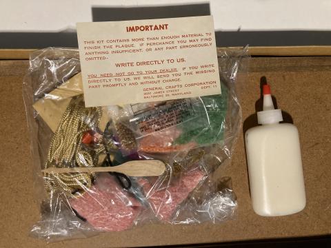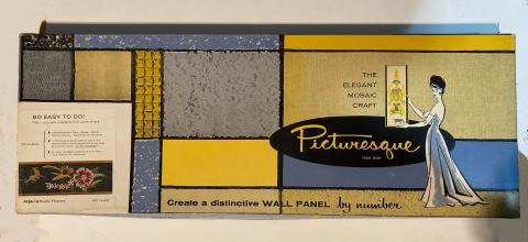 One designed panel, a variety of tiles, stones, sequins and beads, two braided cords, glue
