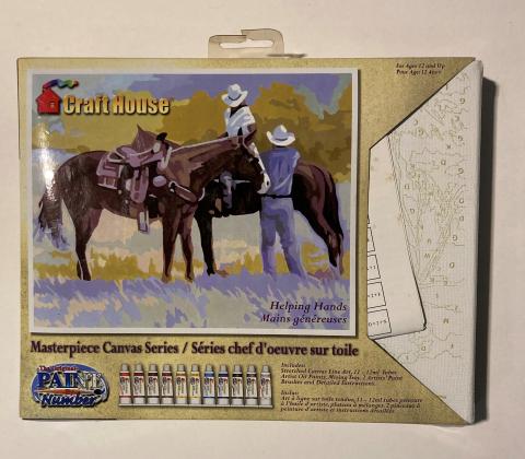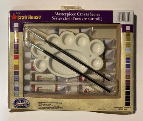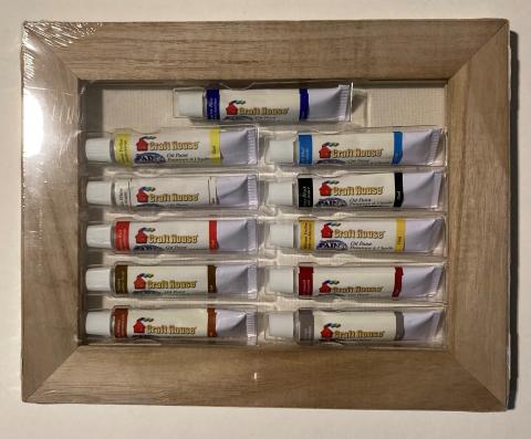 One stretched, mounted canvas, 11 tubes of oil paint, mixing tray