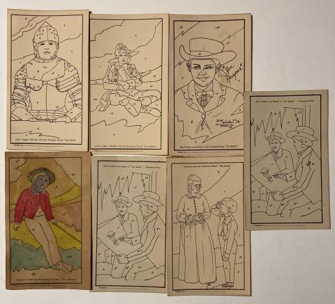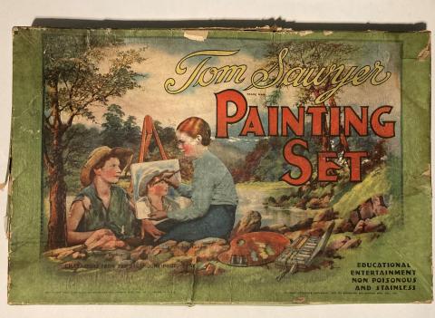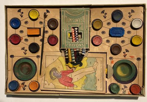 18 paints, 8 Crayons, mixing dishes, 5 small paper scenes, 3 larger scenes