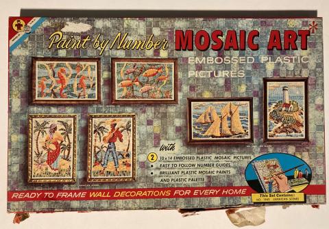 Mosaic Art Dimensions 17x10x1 Manufacturer Transogram Company Kit Contents Two 10x14 embossed plastic pictures, paints, palette Mosaic Art Dimensions 17x10x1 Manufacturer Transogram Company Kit Contents Two 10x14 embossed plastic pictures, paints, palette PreviousNext