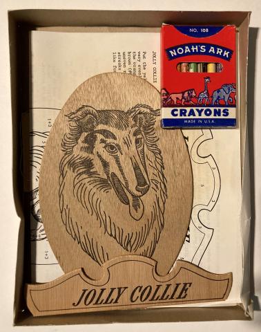 Two pre-cut pieces of wood with designs, 8 crayons, string