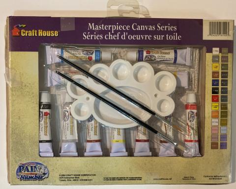 One 9x12 mounted canvas, mixing tray, 11 paints