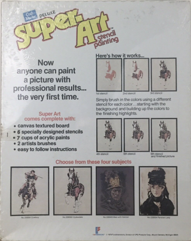 Deluxe Super-Art Stencil PBN 21UUUN3 Manufacturer Craft Master Date 1979 Kit Contents Textured canvas board, 6 stencils, 7 paints Notes Series of 4 kits