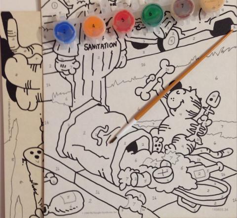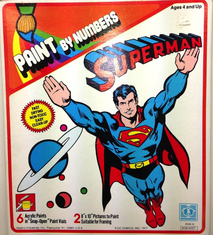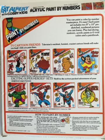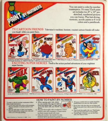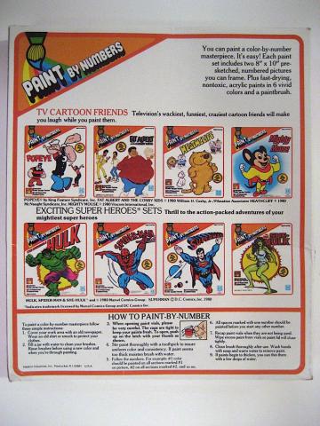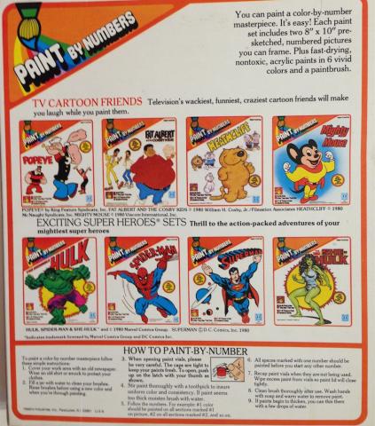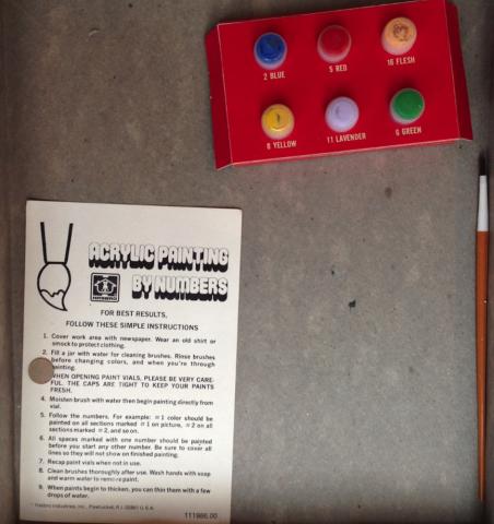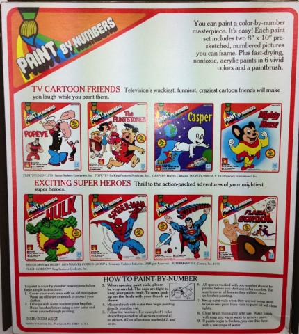 back of kit blank , two 9x10 panels , copyright 1977 on kit , later versions of kit have catalog on back and two 8x10 panels and different paint containers