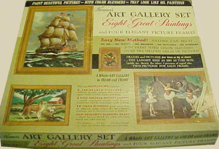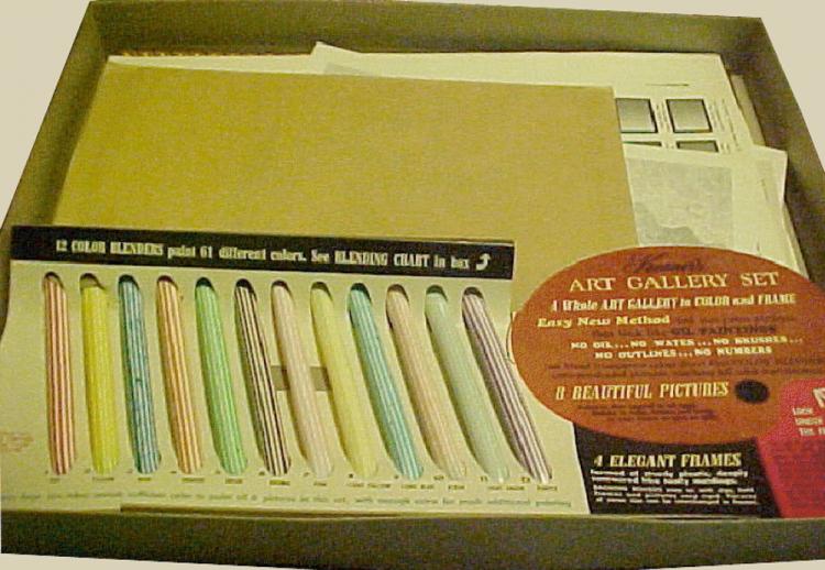 8 pre-shaded paintings (two 4x5, two 16x13, two 10x7, two 12x9), 12 color tubes that can be blended into 60 colors and 4 gold plastic frames