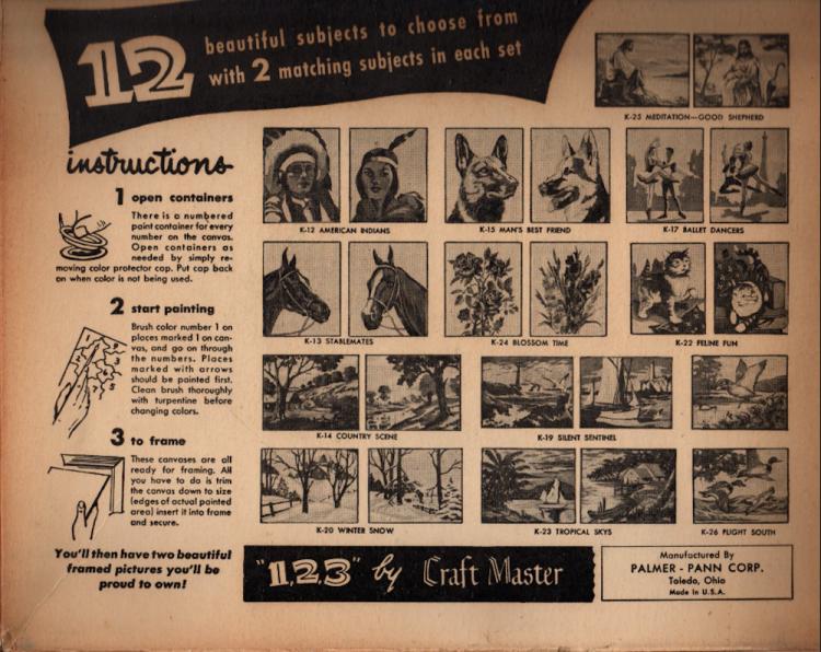 123 BlacknWhite K12-15;17;19;20;22-6 Dimensions 11x9x1 Manufacturer Palmer-Pann Date 1953 Kit Contents Two 8x10 panels, 12 oil colors