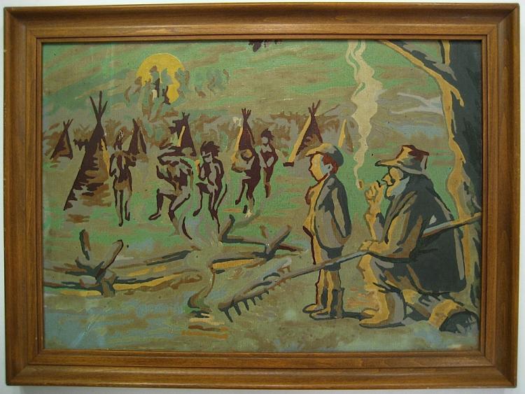 This is a set of 2 paint by numbers editorial cartoons by editorial cartoonist, John T. McCutcheon. His editorial cartoons appeared on the front page of the Chicago Tribune. They first appeared on an annual basis in 1912 and these ran every fall until October 1992 when they were deemed politically incorrect and offensive. McCutcheon was inspired by his boyhood days growing up on a farm in Indiana. He imagined the corn stalks as tepees and the swirling smoke as "Indians". Each measures approximately 15 3/4" x 11 3/4".