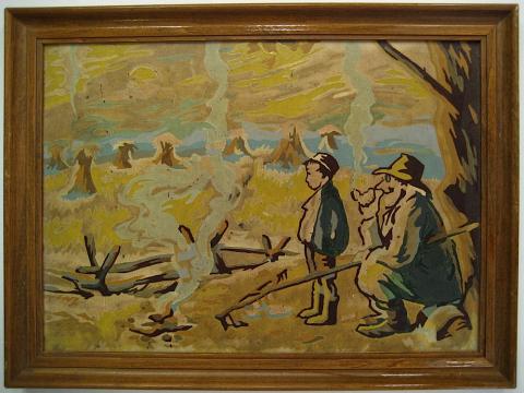 Drawn for the Chicago Tribune September 30, 1907. This is a set of 2 paint by numbers editorial cartoons by editorial cartoonist, John T. McCutcheon. His editorial cartoons appeared on the front page of the Chicago Tribune. They first appeared on an annual basis in 1912 and these ran every fall until October 1992 when they were deemed politically incorrect and offensive. McCutcheon was inspired by his boyhood days growing up on a farm in Indiana. He imagined the corn stalks as tepees and the swirling smoke as "Indians". Each measures approximately 15 3/4" x 11 3/4".