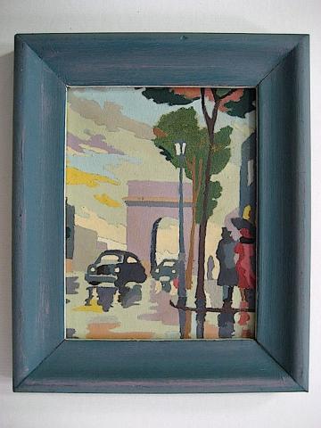 A breath of Paris...this street scene of a warm spring afternoon, a sidewalk cafe, a strolling gendarme and, in the distance, the Eiffel Tower.